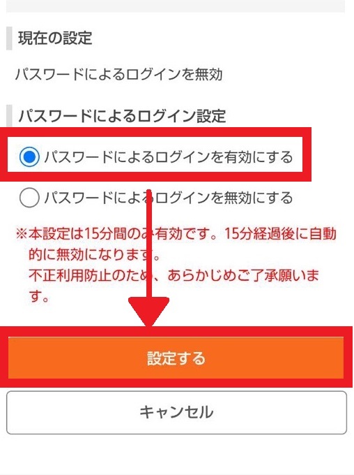 「パスワードによるログイン設定を有効にする」を選択し、「設定する」を押す。