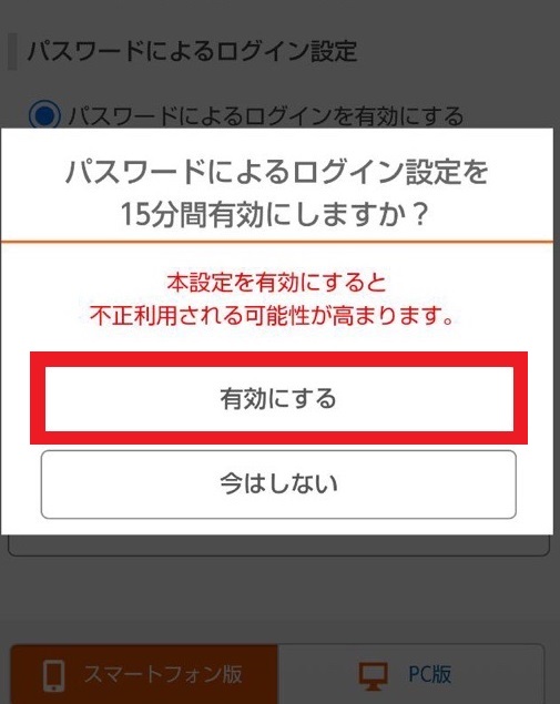 設定していない端末(パソコンなど)からログインしたい場合は、「パスワードによるログイン設定」を有効にすると、他端末からでもログインが可能になります。